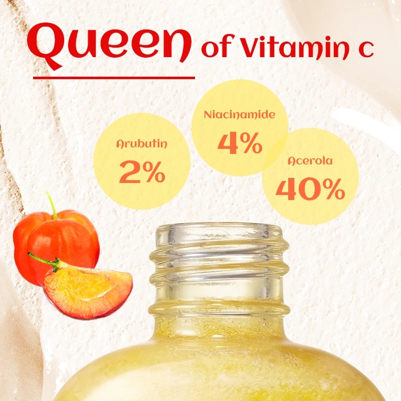 ⇒ Vitamine C (40 % d'extrait de cerise acérola) : Connue comme la « reine de la vitamine C », la cerise acérola fournit une forme très stable et douce de vitamine C, offre une puissante protection antioxydante, illumine le teint et soutient la santé de la barrière cutanée pour une luminosité durable.