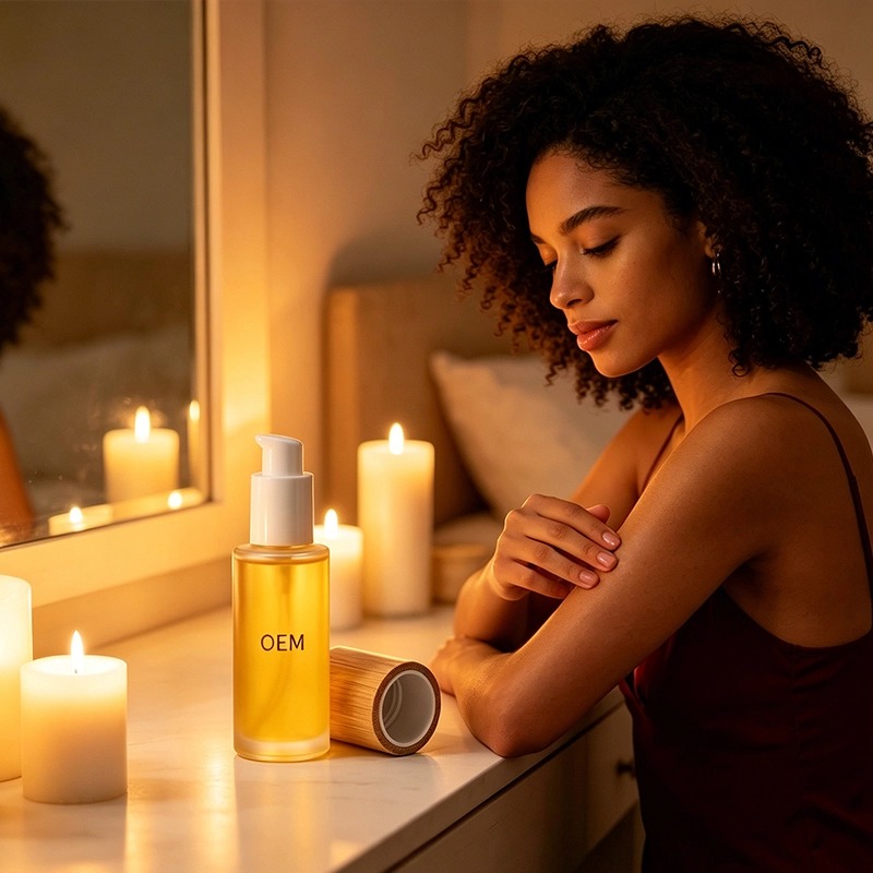 Une huile corporelle éclaircissante à absorption rapide qui atténue le teint terne et unifie la peau sans laisser de film gras. Enrichie en niacinamide et en dérivés de vitamine C, elle laisse un fini naturellement frais et lumineux sur le visage et le corps. Fruit de notre recherche et développement menée par un docteur et réalisée en salle blanche conforme aux normes GMPC. Faible quantité minimale de commande, échantillonnage rapide. Votre formule, votre emballage. Prêt(e) à lancer une huile corporelle éclaircissante et clean pour votre marque ? Parlons formule, emballage et quantité minimale de commande – échantillon disponible sous 15 jours.