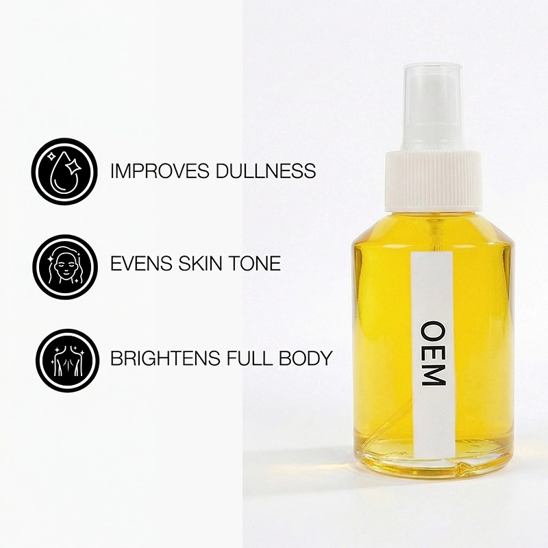 Une huile éclaircissante à absorption rapide qui redonne de l'éclat aux teints ternes et unifie le teint jour après jour. Enrichie en niacinamide et en dérivés de vitamine C, sa texture légère et non grasse convient au visage et au corps. Fruit de notre recherche et développement menée par un docteur et réalisée en salle blanche conforme aux normes GMPC. Faible quantité minimale de commande, échantillonnage rapide. Votre formule, votre emballage.