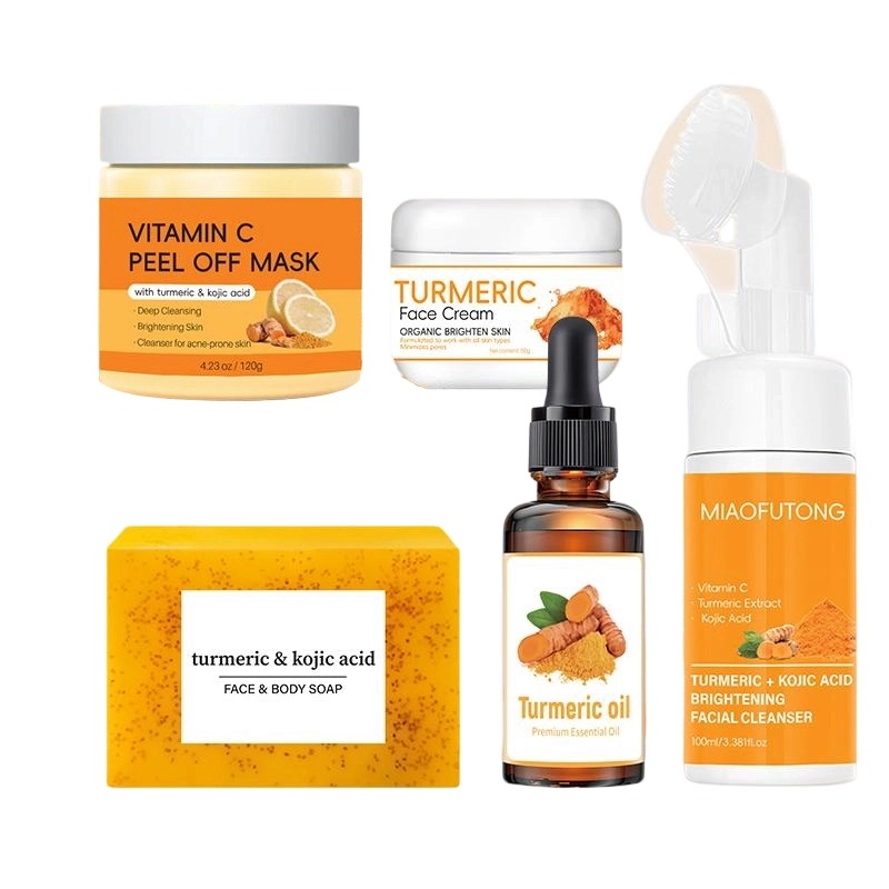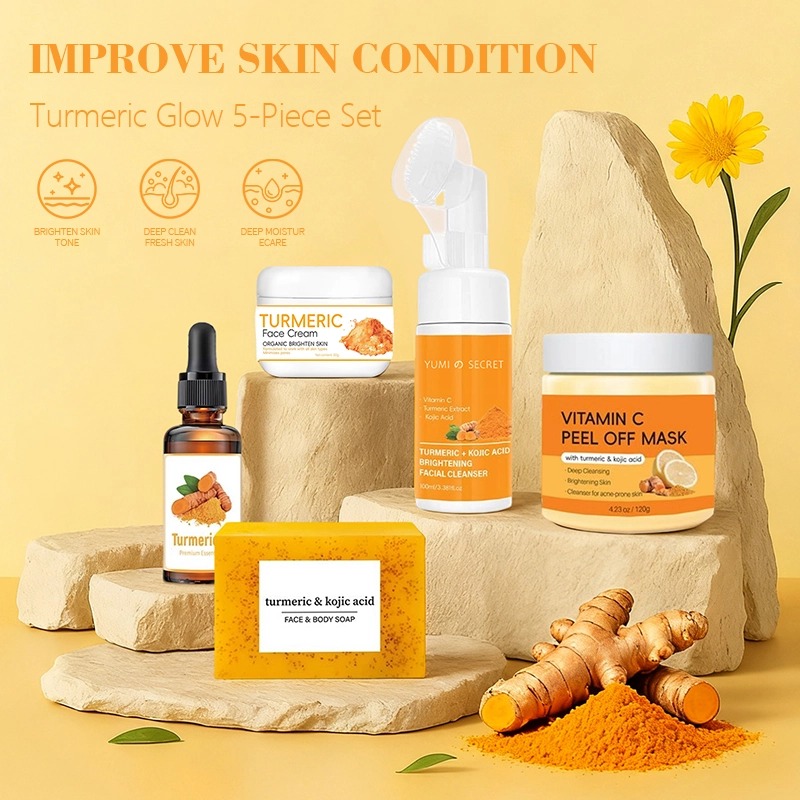 Ce coffret de 5 produits au curcuma cible les cicatrices d'acné, les taches brunes, le teint terne et les pores dilatés, offrant une routine quotidienne complète pour une amélioration visible de la peau.