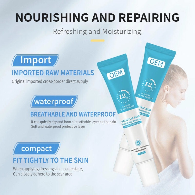 Notre gel anti-acné et cicatrices est un soin haute performance, formulé avec expertise pour une personnalisation OEM/ODM. Il associe le pouvoir du glycérol, de l'acide kojique, de l'acide salicylique et de la sauge rouge (Salvia miltiorrhiza) pour des résultats visibles en seulement 12 heures. Conçu pour traiter l'acné, apaiser les irritations et atténuer divers types de cicatrices, ce produit est idéal pour les marques internationales ciblant différents marchés.